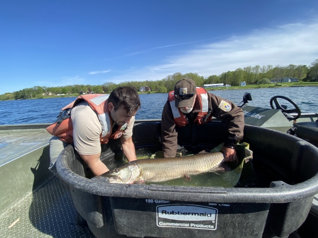 USFWS biologist releasing musky back at catch site.
