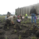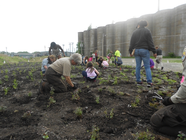 Fish Biologist Betsy Trometer helps students plant an urban pollinator garden as part of the Schoolyard Habitat Program.