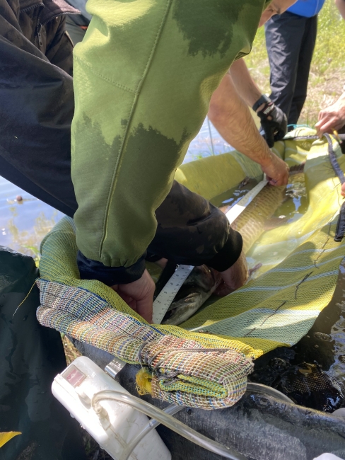 Using a nylon bag, researchers can lift a musky out of the water to take measurements and collect genetic samples.