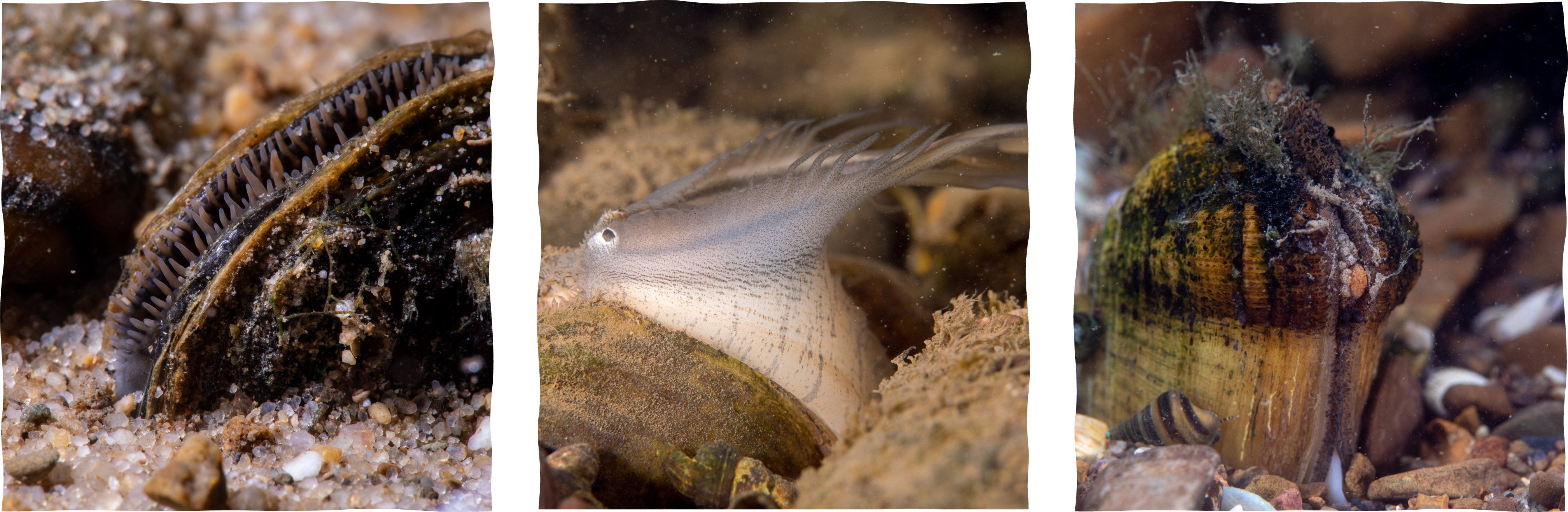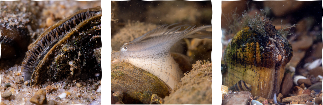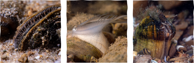 Various species of freshwater mussels including Eastern Elliptio (Elliptio complanata), Plain pocketbook (Lampsilis cardium), and Cumberlandian combshell (Epioblasma brevidens) tucked into the river bottom all the while filtering and improving the water quality around them. Photo Credit: Ryan Hagerty/USFWS