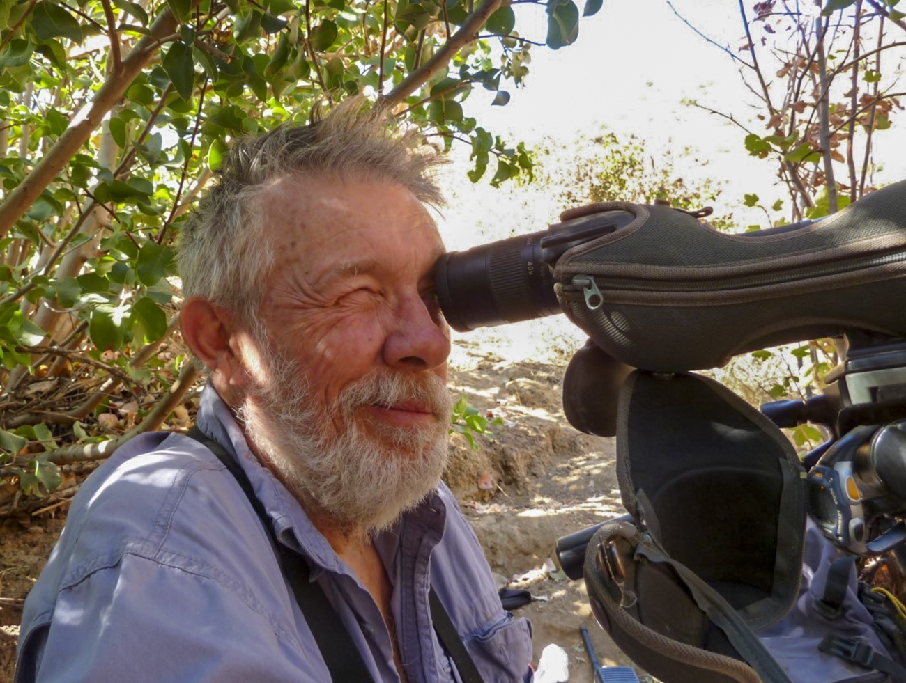 Vince Gerwe, U.S. Fish and Wildlife Service volunteer and former president and founder of Friends of California Condors Wild and Free, observes condors through a spotting scope. Vince helped track condors as a volunteer and was instrumental to the recovery program. Credit: USFWS