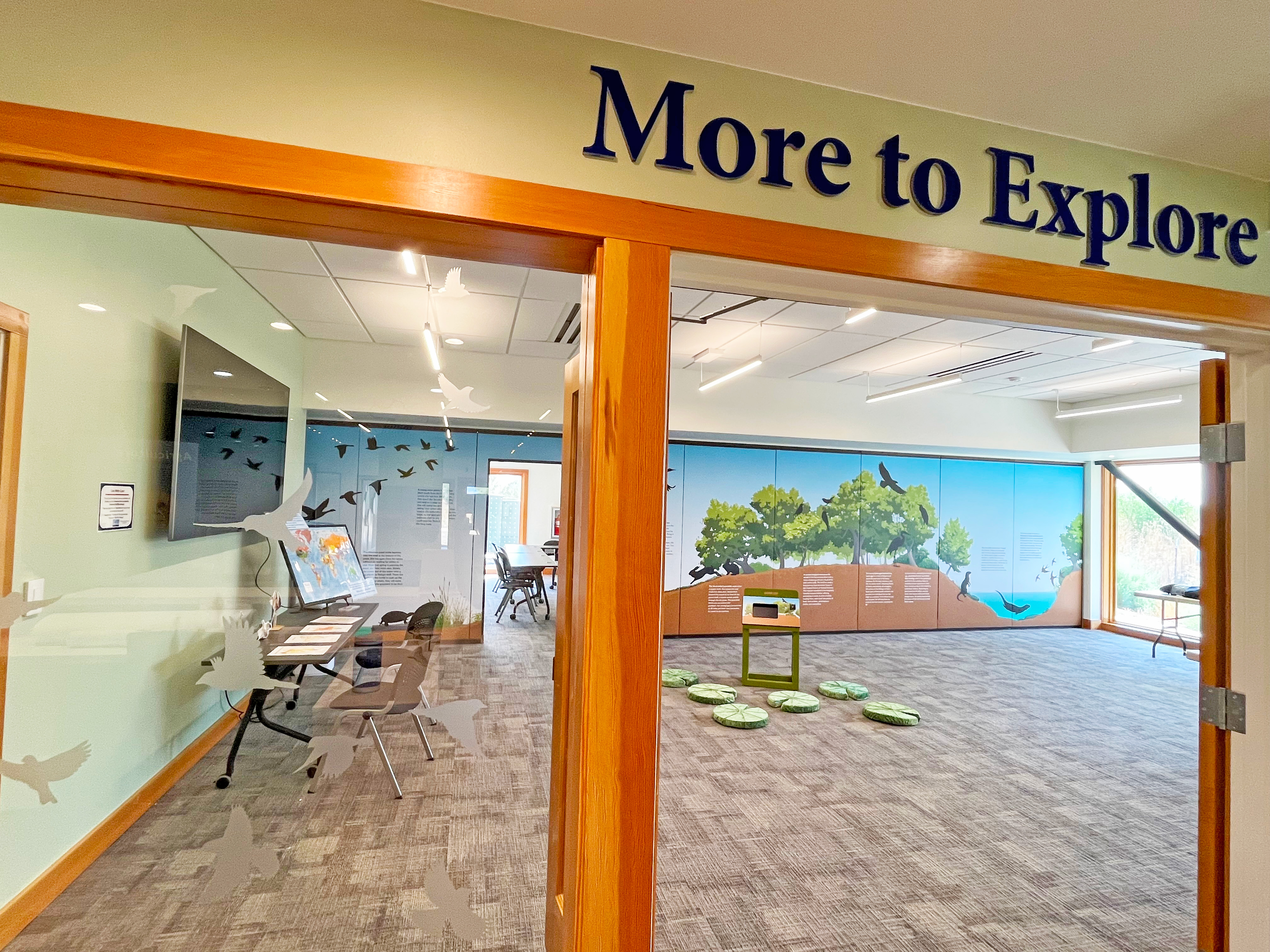 Discovery Room at Sacramento National Wildlife Refuge's Visitor Center, including a large room with a television, a mural of Sacramento Valley habitats and wildlife, and a multimedia station.