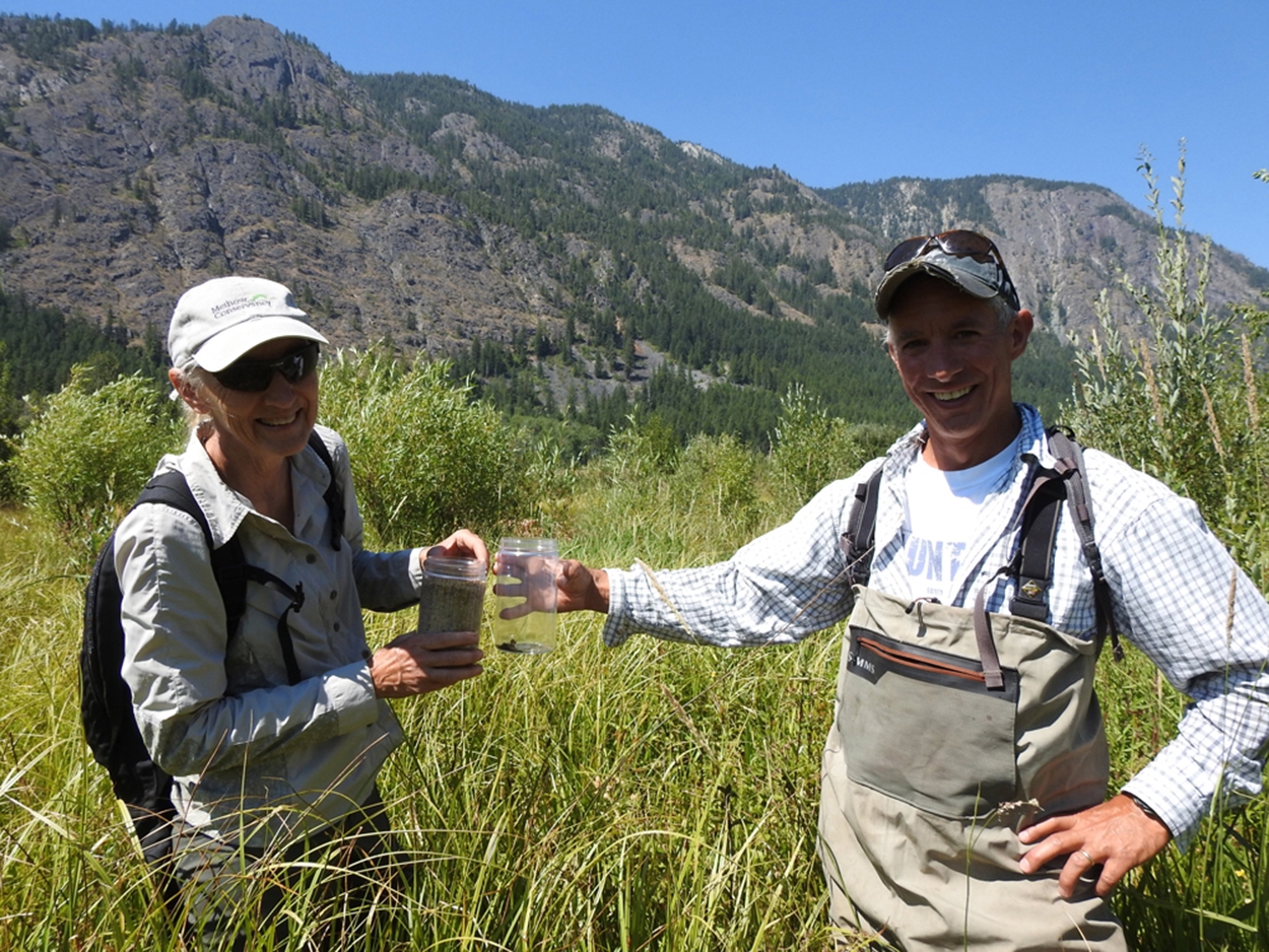 Volunteers Jan Sodt and Scott Stluka collect sedge seeds for a habitat restoration project.
