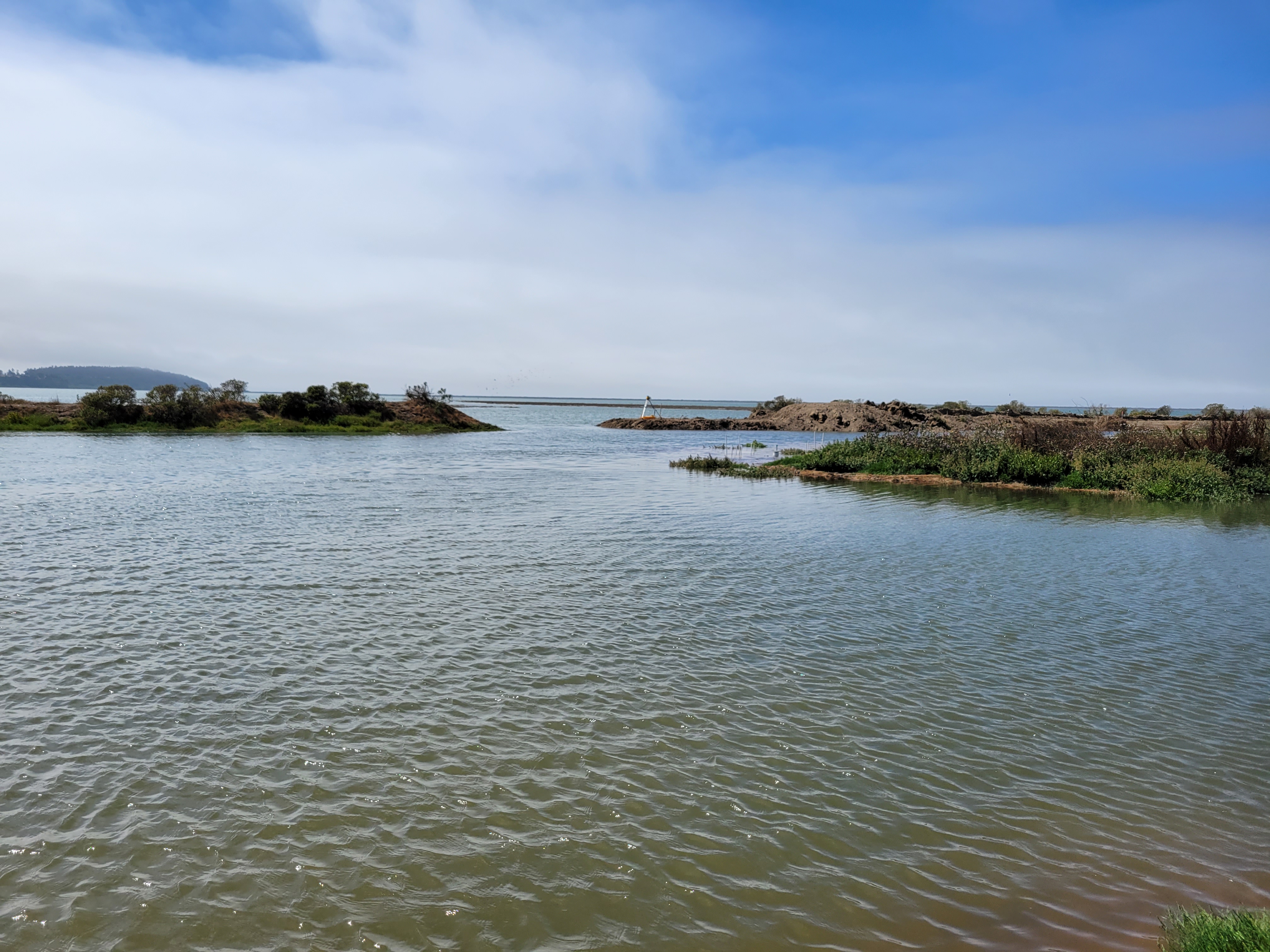 Water from Humboldt Bay enters White Slough at high tide through the newly excavated tidal breach.