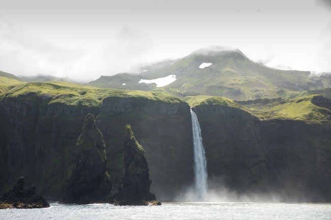 Tanaga Island waterfall plunges into the Bering Sea in the Aleutian Islands unit of the Alaska Maritime National Wildlife Refuge.