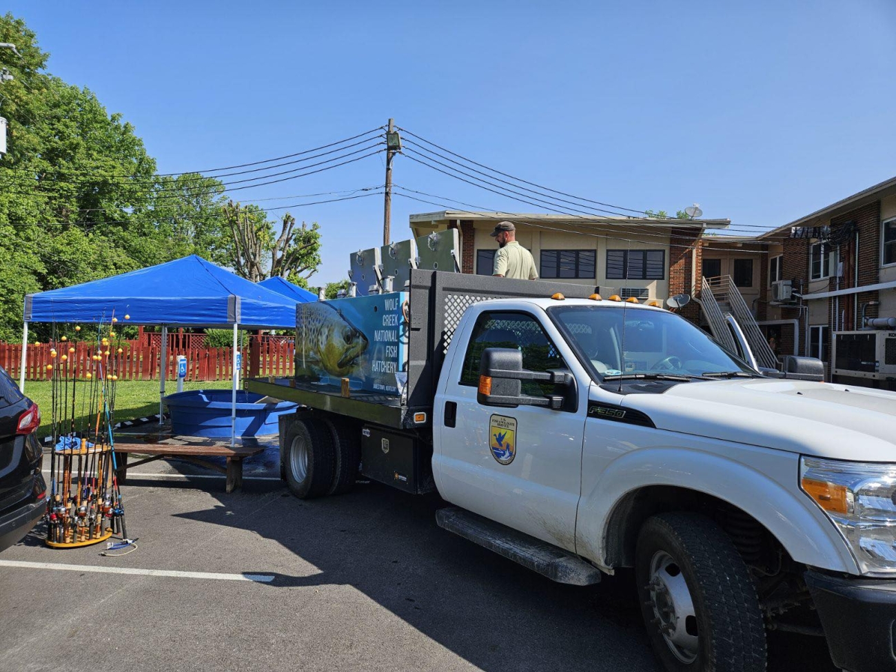 Staff at Wolf Creek National Fish Hatchery unloading Rainbow trout into a tank for Signature Healthcare at Summit Manor residents to catch for their 2023 fishing event.