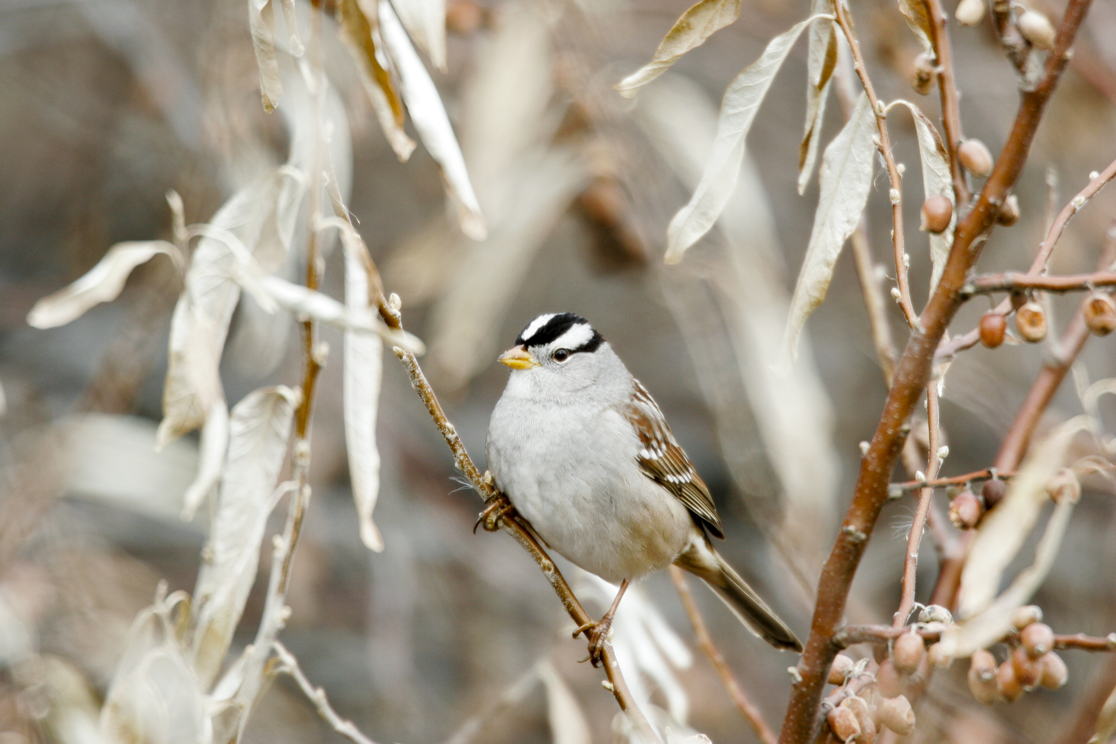 White crowned sparrow in Russian olive tree