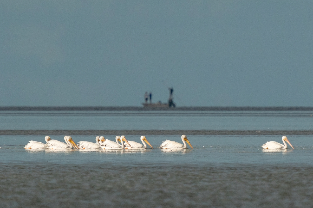 White Pelicans swimming and Flats fishing boat in the background at Key West National Wildlife Refuge