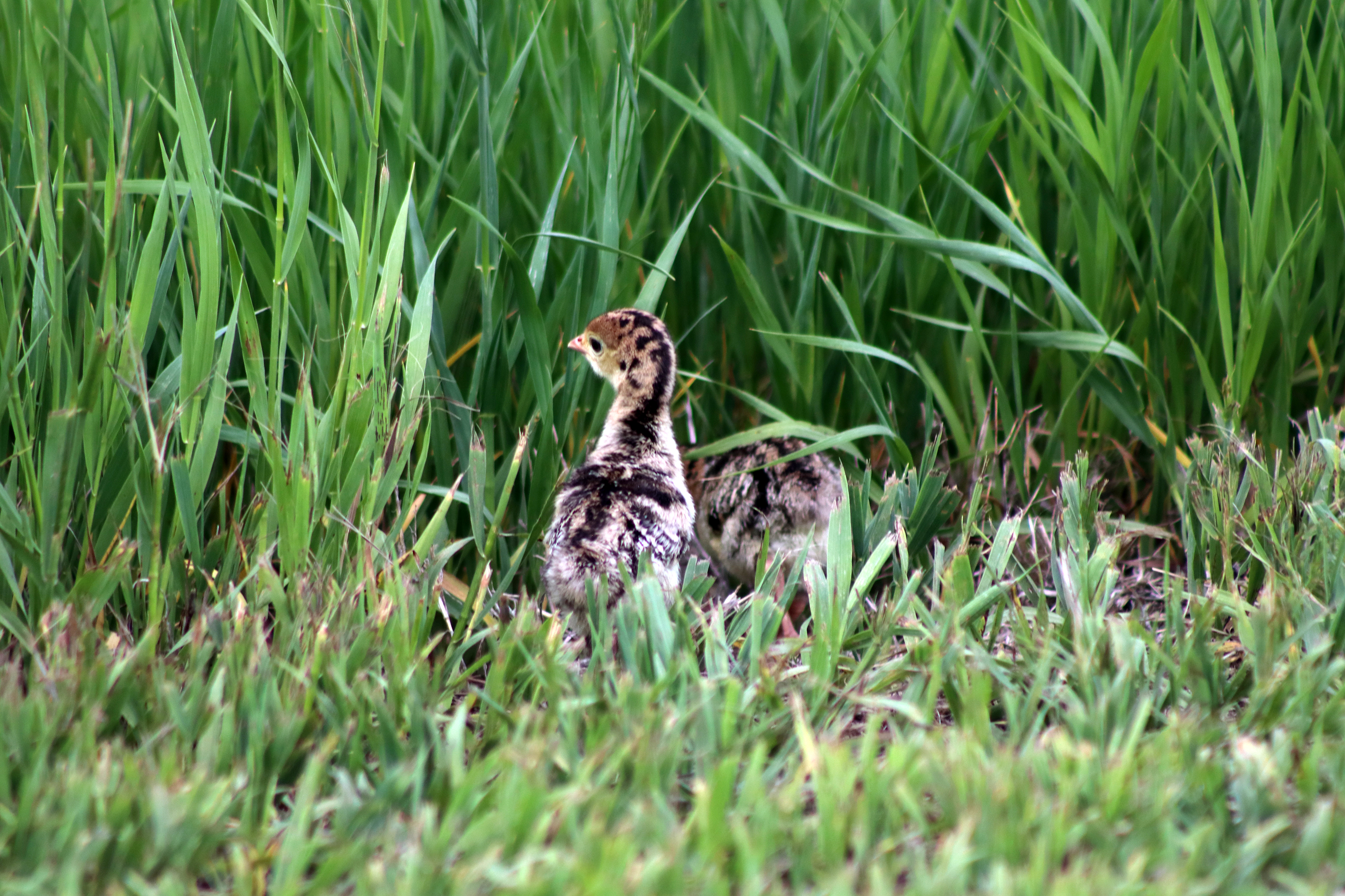 In the spring, wild turkey chicks hide in the tall grass eating insects.