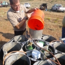 A biologist from Jones Hole National Fish Hatchery (Utah) places fish into a compartment to fly away.