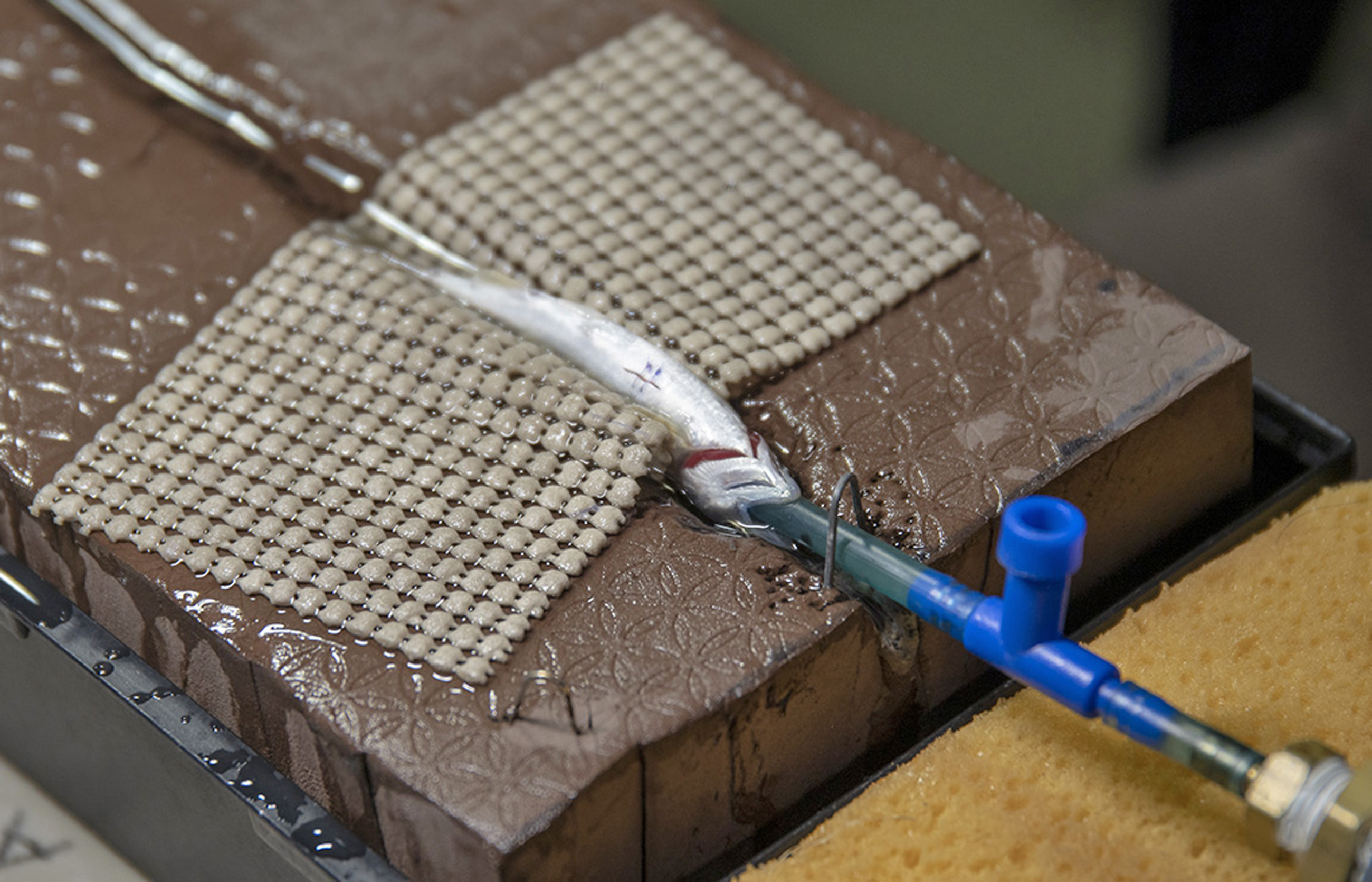 A winter-run juvenile Chinook salmon after an acoustic tag was surgically implanted