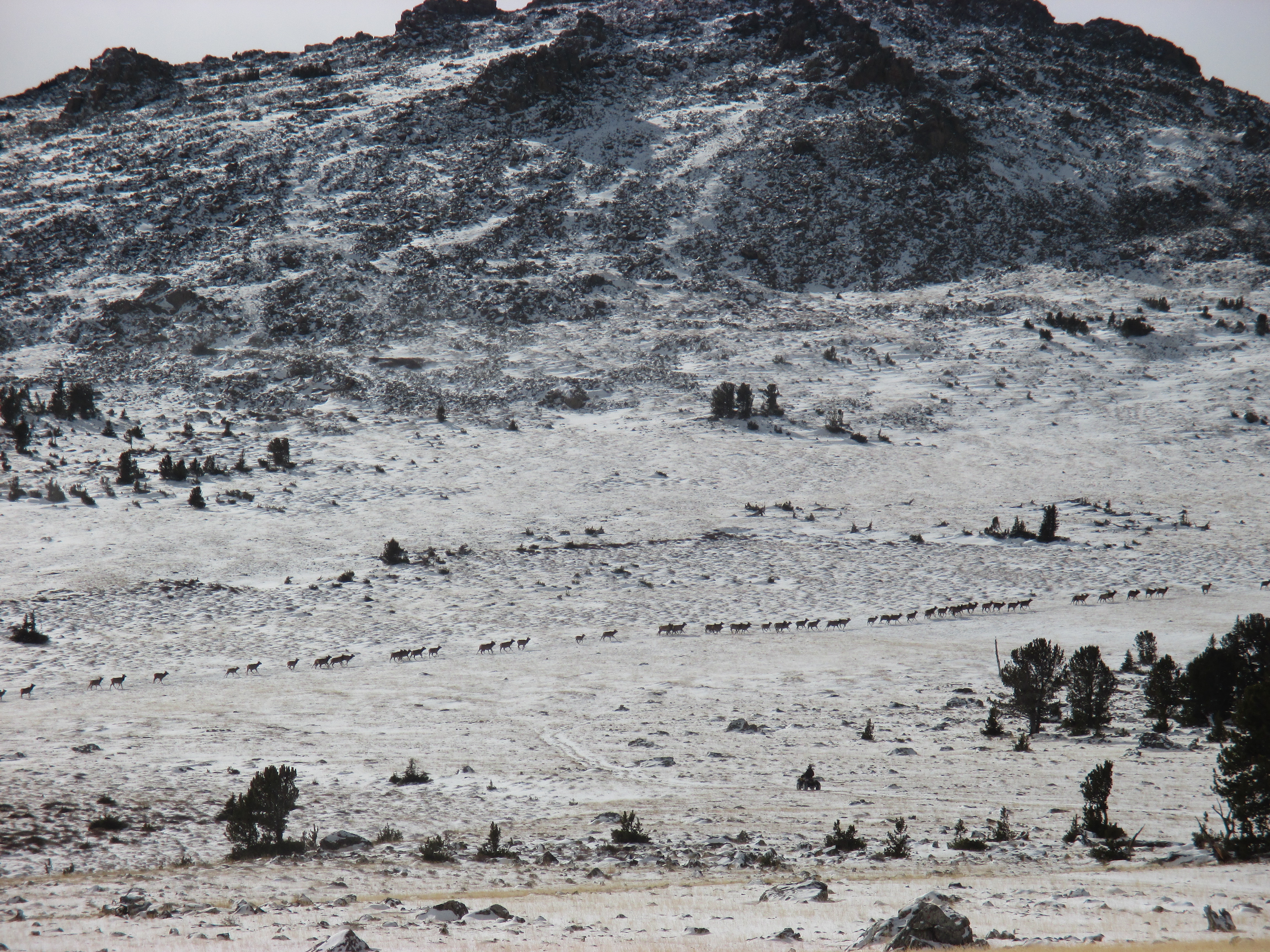 Wintering elk on Kirkland Mountain of the Wind River Indian Reservation moving from foraging habitat across Indian Ridge and into a commonly used bedding area.