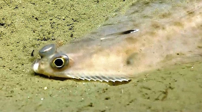 A witch flounder scoots across Atlantic Ocean bottom within Northeast Canyons and Seamounts Marine National Monument off New England.