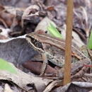 A wood frog hides in leaf litter on the forest floor at Necedah National Wildlife Refuge in Wisconsin.