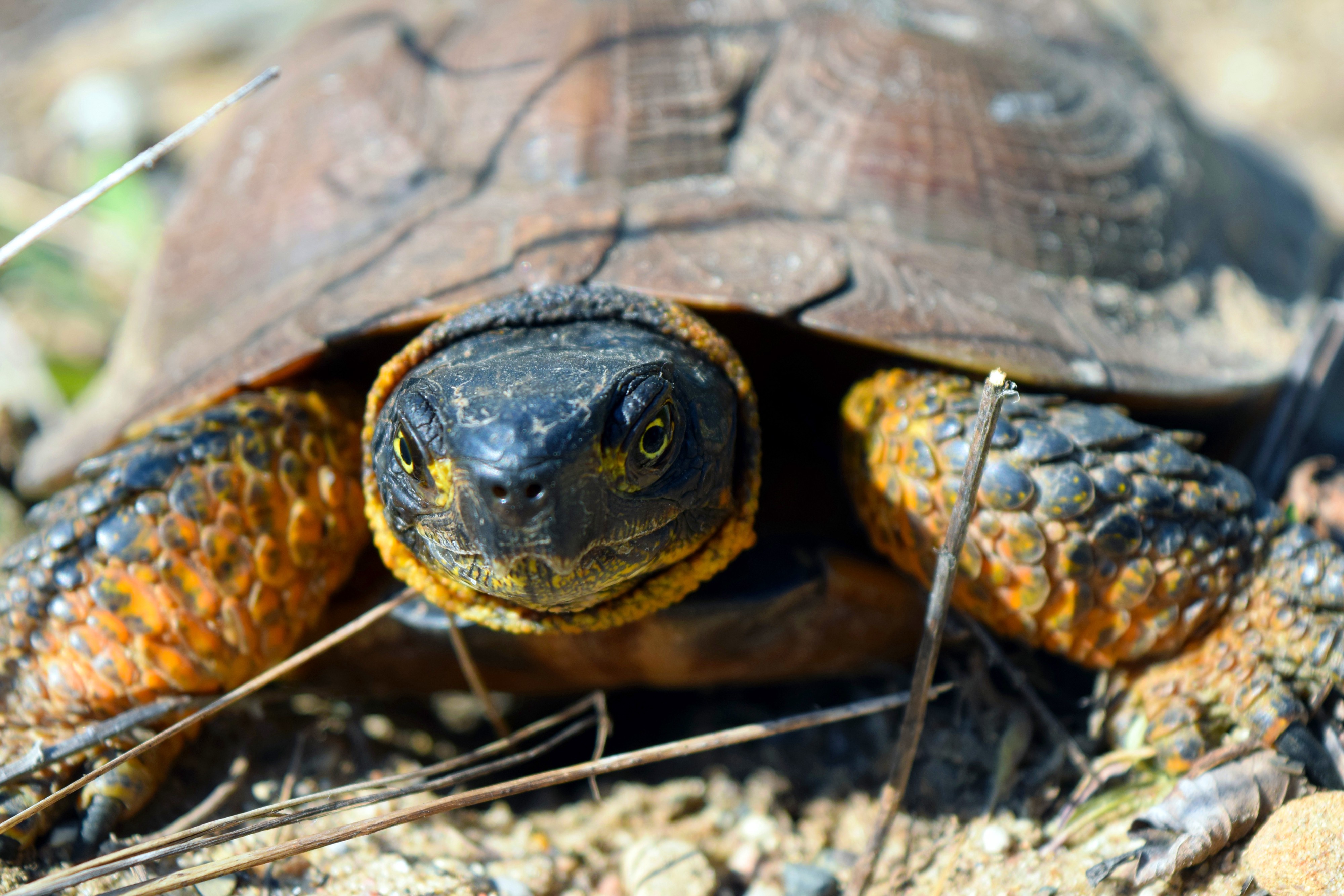 Wood turtle, Glyptemys insculpta. Combination of the Greek words Glyptos, meaning ‘carved’, and emys, meaning ‘freshwater tortoise’; insculpta, from the Latin word insculptus, meaning ‘engraved’. Lives along permanent but shallow, clear-water streams with compacted sand and cobble bottoms. Spends much of its time on land and can be found in deciduous woods, cultivated fields, and marshy pastures, earning it the nickname ‘tortoise’ (land-dwelling) rather than ‘turtle’ (water-dwelling.) Endemic to North America, it has survived multiple southward glacial encroachments and now ranges from Nova Scotia to Virginia.