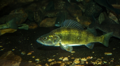 Yellow perch (Perca flavescens), in aquarium at Gavins Point National Fish Hatchery, South Dakota.