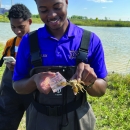 A young man inspects a native crayfish species during an event highlighting a day in the life of a fisheries biologist
