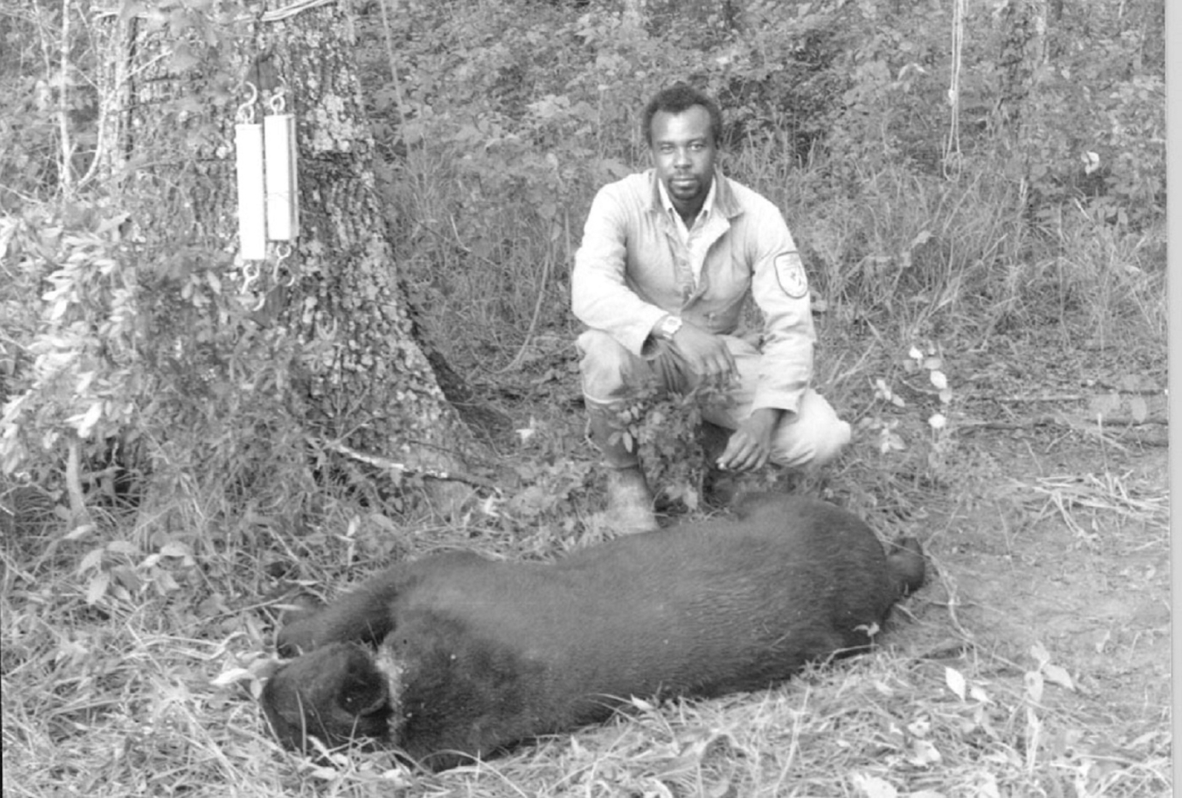 A younger Tobin and a black bear trapped at the Tensas River National Wildlife Refuge (the bear was OK, merely sedated). Tobin’s conservation career began about four decades ago in his native South Carolina.