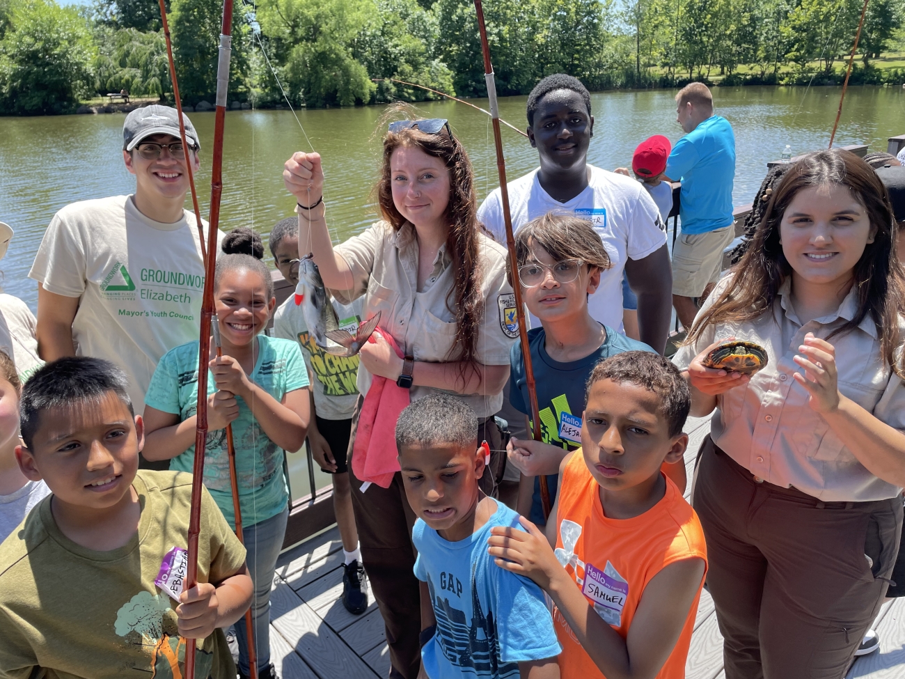 Youth and U.S. Fish and Wildlife Service staff pose with a fish they caught at the 2024 Cops and Bobbers Fishing Program as part of the Elizabeth Urban Wildlife Refuge Partnership.