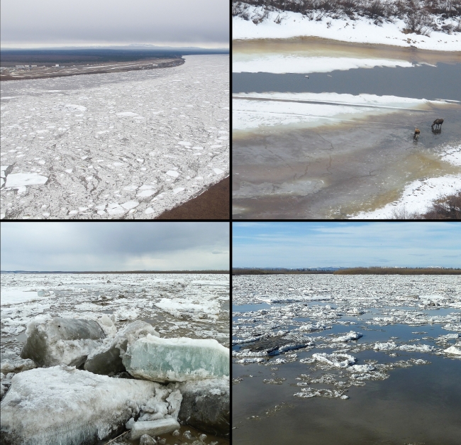Each spring the frozen rivers of Alaska melt, shift, break up and once again flow as waterways. The images above show stages of the Yukon River breakup over several days in mid-May 2012.