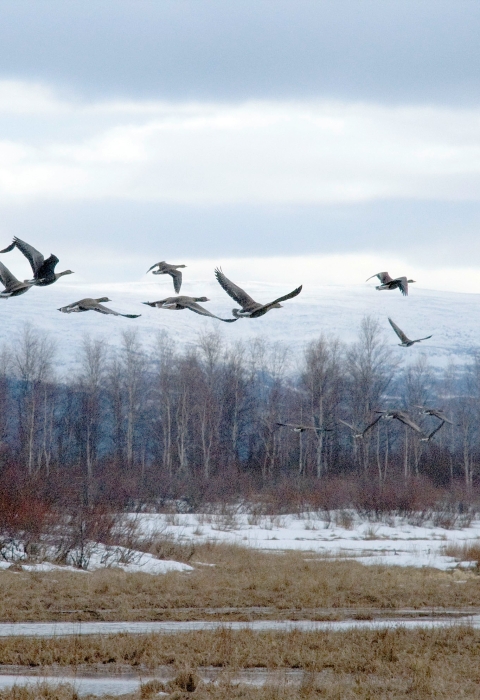 Each year we conduct an aerial line transect survey of Greater White-fronted and Canada Geese during their molting period. Concerns in the 1990s about declines in the interior and northwest Alaska-breeding populations of white-fronts (aka “mid-continent population”) sparked increased attention to this species. Similar and complementary surveys are conducted on other refuges in interior Alaska to provide a regional view of distribution and numbers of white-fronts.