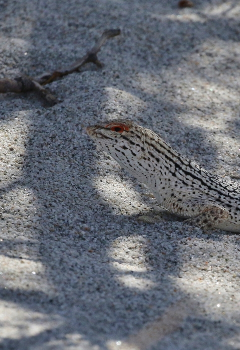 The Coachella Valley fringe-toed lizard has a white or sandy-colored belly and back, and light eye-like patterns that form shoulder stripes. It has elongated scales on its hind feet, known as fringes thatprovide added traction in loose sand. These lizards also have a shovel-shaped head and lower jaw to aid diving into and moving short distances beneath the sand. The Coachella Valley fringe-toed lizard also has elongated scales that cover its ears to keep sand out, and specialized nostrils that allows it to breathe below the sand without inhaling sand particles.