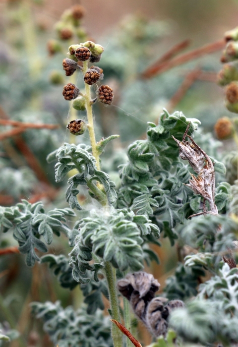 The San Diego ambrosia is a clonal herbaceous perennial plant in the family Asteraceae, which includes sunflowers. It spreads vegetatively by means of slender, branched, underground root-like rhizomes from which new above ground stems sprout each year after the winter rains. These stems generally grow 2 to 12 inches high, often forming mats characterized by pinnately divided gray-white leaves that are covered in short hairs. Stems may produce yellowish to greenish-colored flowers that appear from April to October.
