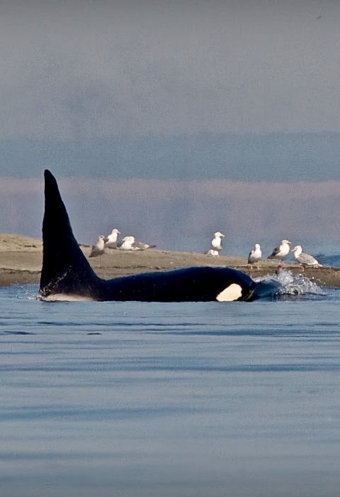Killer Whales are distinctively marked, with a black back, white chest and sides, and a white patch above and behind the eye. Calves are born with a yellowish or orange tint, which fades to white. Killer Whales have a heavy and stocky body and a large dorsal fin with a dark grey "saddle patch" at the fin's rear. Males can be up to 9.5 m long (31 ft) and weigh in excess of 6 tonnes; it has been reported that especially large males have reached nearer 8 tonnes. Females are smaller, reaching up to 8.5 m (28 ft) and a weight of about 5 tonnes. The longest Killer Whale ever recorded was a male from Washington state, measuring 9.8 m (32 ft). Calves at birth weigh about 180 kg and are about 2.4 m long (8 ft). The Killer Whale's large size and strength make them the fastest marine mammals, often reaching speeds in excess of 56 km/h (35mph).