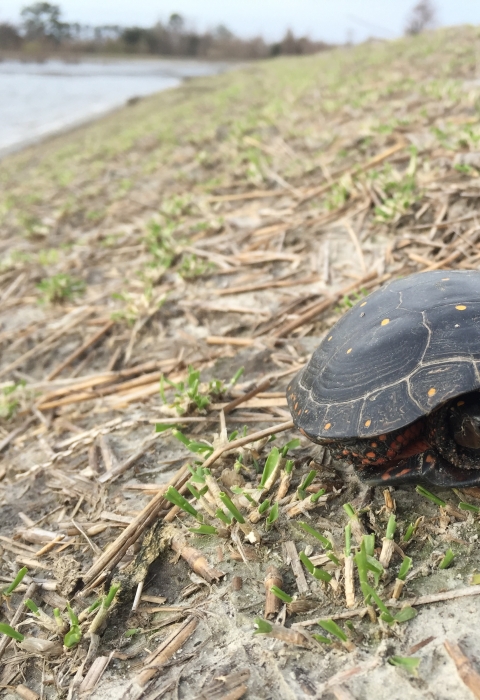 Spotted turtles are small, aquatic turtles, named for the yellow polka dots scattered across their dark shells. The species occur in wetlands throughout the east coast and in the Great Lakes region of the United States, and is threatened by the loss, alteration, and fragmentation of this habitat. Climate change has the potential to impact the hydrology of the wetlands the species depends upon over time. Poaching and collection for the foreign and domestic pet trade also pose a threat for spotted turtle populations.