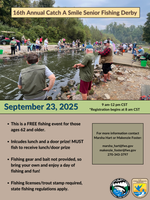 Image DetailsEvent date and timeSep 23, 2025 8:00 am - Sep 23, 2025 12:00 pm (EST) Event location nameWolf Creek National Fish Hatchery Event categoryOutdoor ActivityAudience(s)AnglerAge rangeAll agesRecreational activitiesFishing Facility(ies)Wolf Creek National Fish HatcheryProgram(s)Fish and Aquatic Conservation