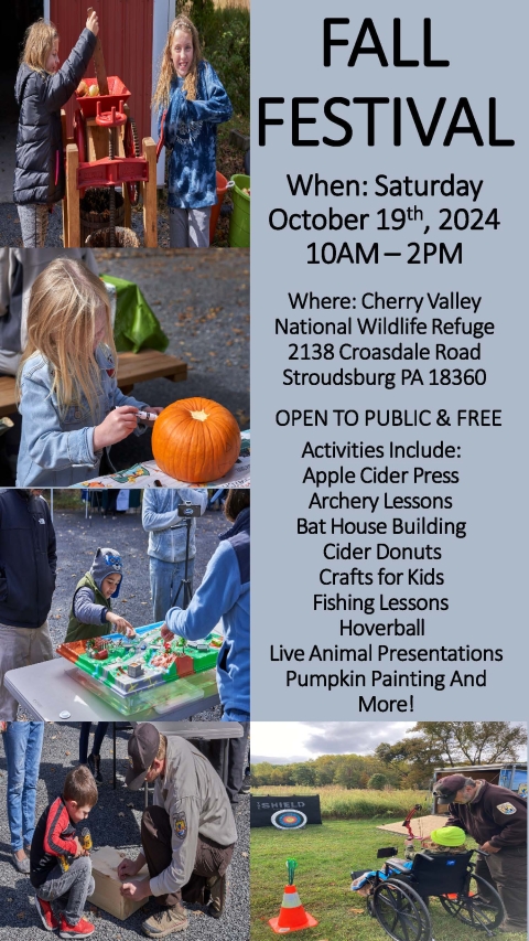The 2024 Cherry Valley National Wildlife Refuge Fall Festival will be held rain or shine on Saturday October 19th, 2024 from 10AM-2PM at the Cherry Valley National Wildlife Refuge Headquarters location at 2138 Croasdale Road, Stroudsburg, PA 18360. This free and family-friendly event will include apple cider pressing, archery lessons, bat house building, cider donuts, crafts for kids, fishing lessons, hoverball lessons, live animal presentations, pumpkin painting, and more!