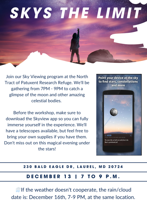 Join us for a special Sky Viewing program at the North Tract of Patuxent Research Refuge on December 13th (with a rain/cloud date of December 16th)! This unique after-hours event gives you the chance to explore the night sky and view the Moon as well as four stunning planets: Venus, Saturn, Jupiter, and Mars! ๐๐ญ