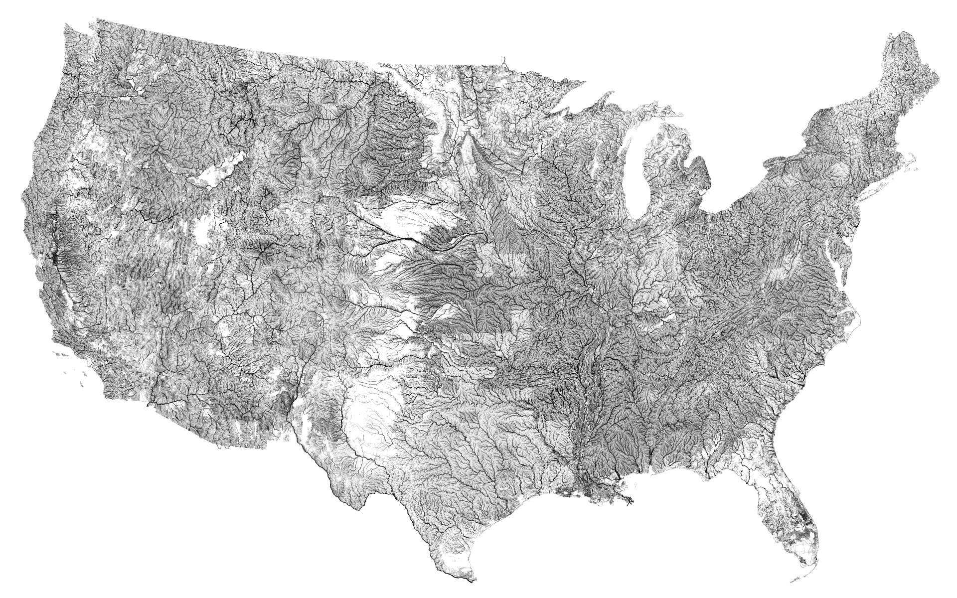 An overlay map showing the multitude of rivers across the continental United States. Notice how the amount of rivers make the map of roads seem so much smaller and insignificant in comparison. Photo: Michael Bostock - GitHub/mbostock