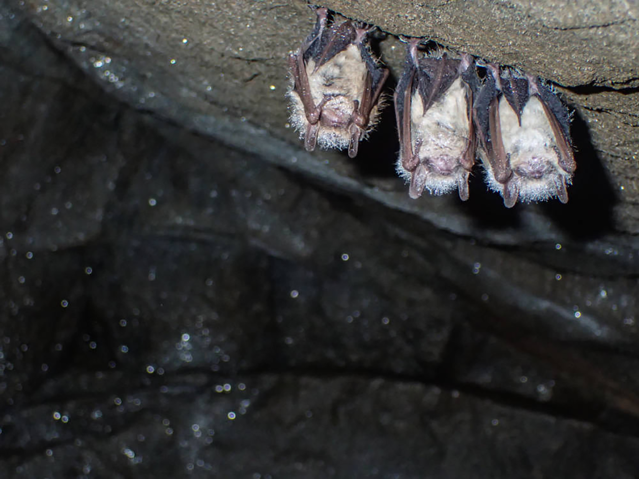 A trio of dew-covered tricolored bats in an abandoned mine on Nantahala National Forest, Macon County, North Carolina.
