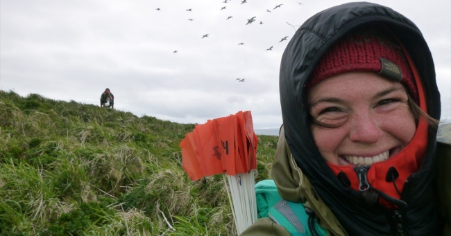 Biologist Sarah Youngren sets up survey flags on burrows to study nesting seabirds on Aiktak Island in the Aleutians.