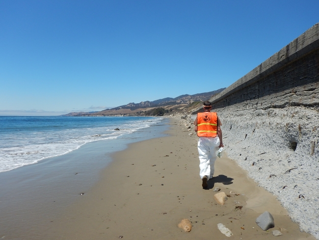 U.S. Fish and Wildlife Service biologist Jeff Phillips surveys along Arroyo Quemada Beach in Goleta, California to assess damage in the early days of the Refugio oil spill.