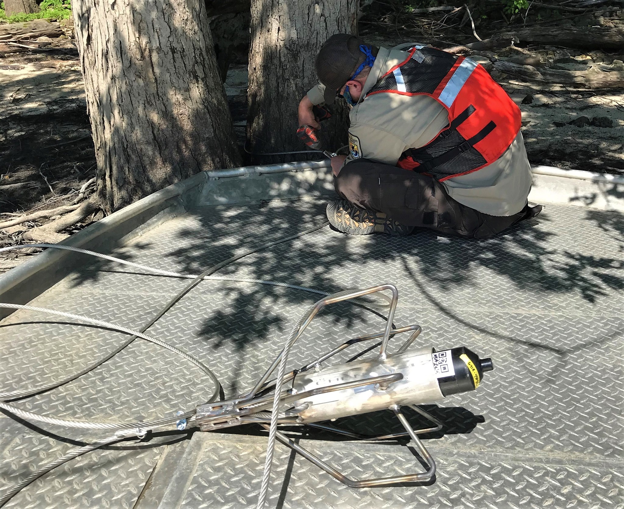 FWS biologist installing telemetry reciever to tree on the Mississippi River.