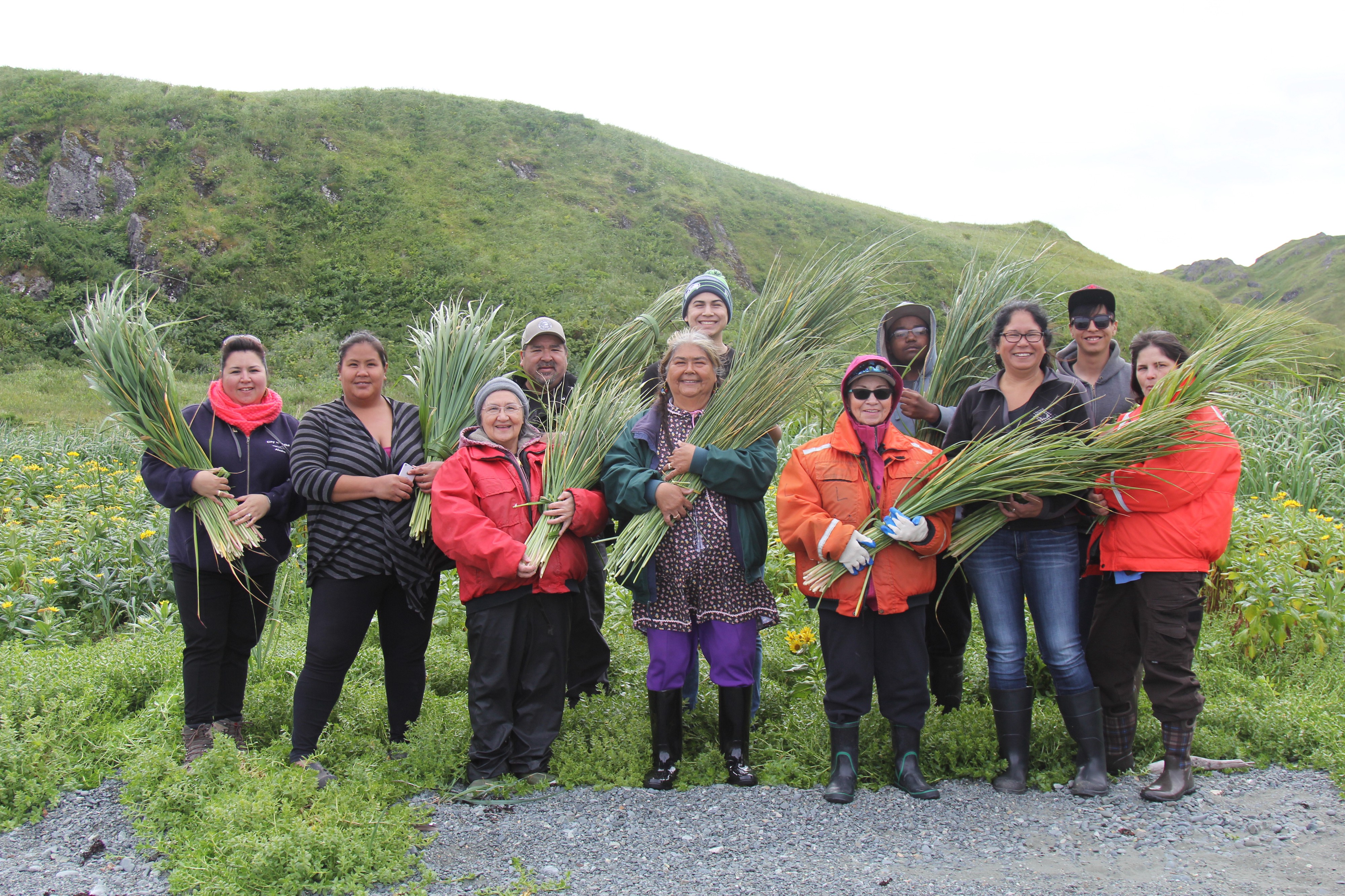 Unangax people pose with bunches of grass they have gathered on Attu Island near the site of Attu Village during a return to the island for descendants facilitated by Alaska Maritime National Wildlife Refuge.