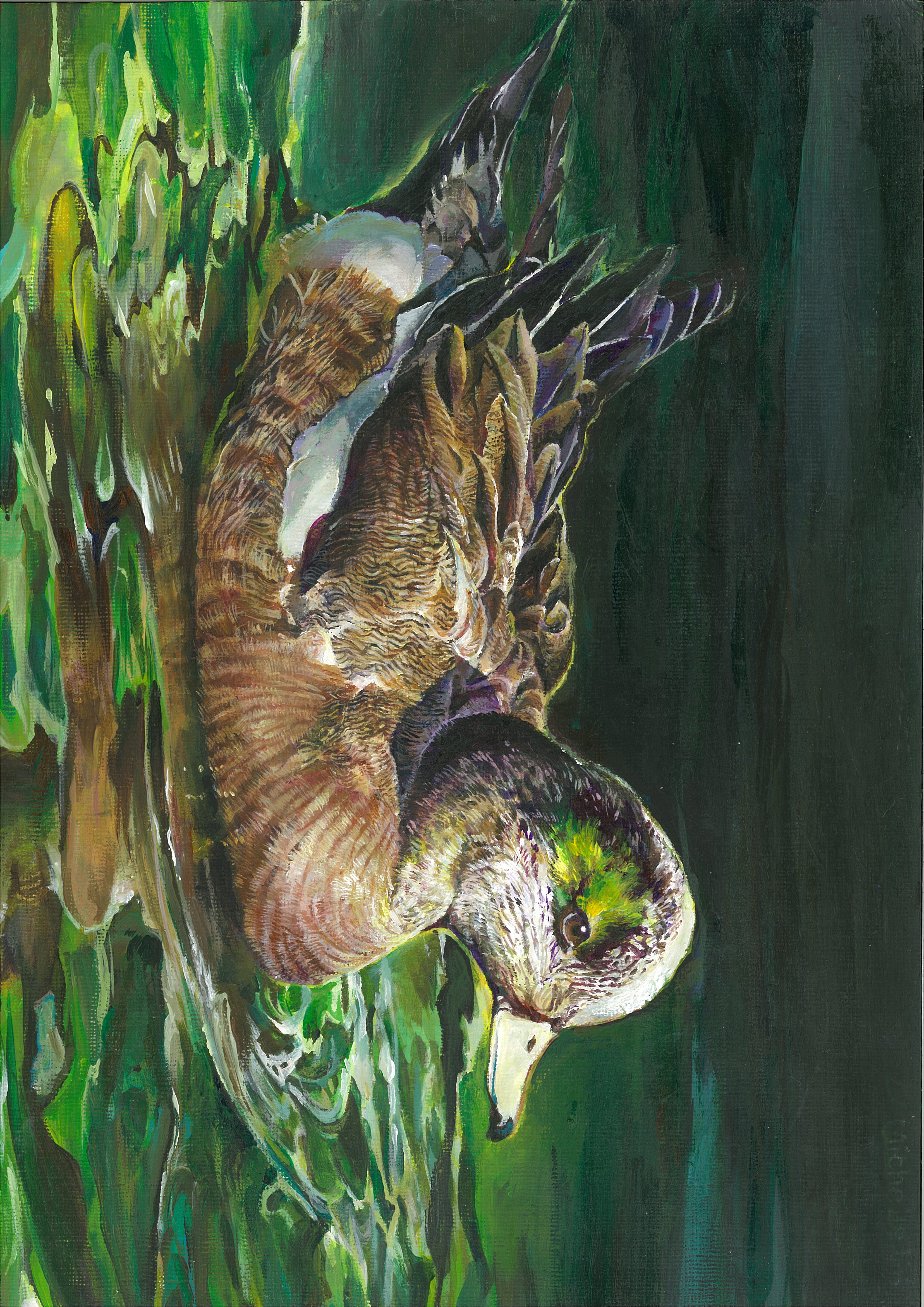 2023 CA JDS Artwork Winner: Michelle Lin, Age 16 from Fremont CA at Irvington High School with an acrylic realistic medium titled "Glimpse of Temperance" depicting American Wigeon