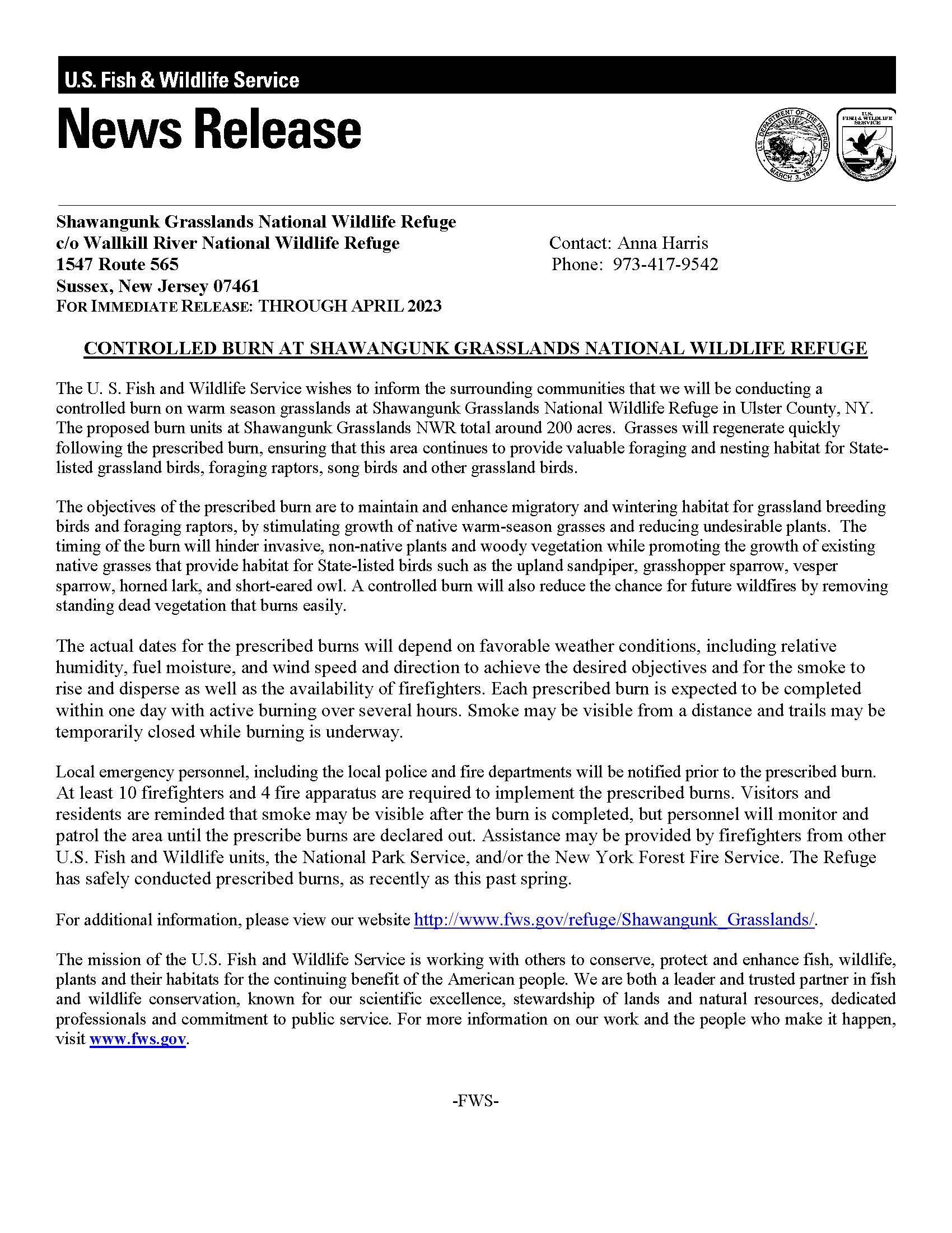 The U. S. Fish and Wildlife Service wishes to inform the surrounding communities that we will be conducting a controlled burn on warm season grasslands at Shawangunk Grasslands National Wildlife Refuge in Ulster County, NY. The proposed burn units at Shawangunk Grasslands NWR total around 200 acres. Grasses will regenerate quickly following the prescribed burn, ensuring that this area continues to provide valuable foraging and nesting habitat for State-listed grassland birds, foraging raptors, song birds and other grassland birds.
