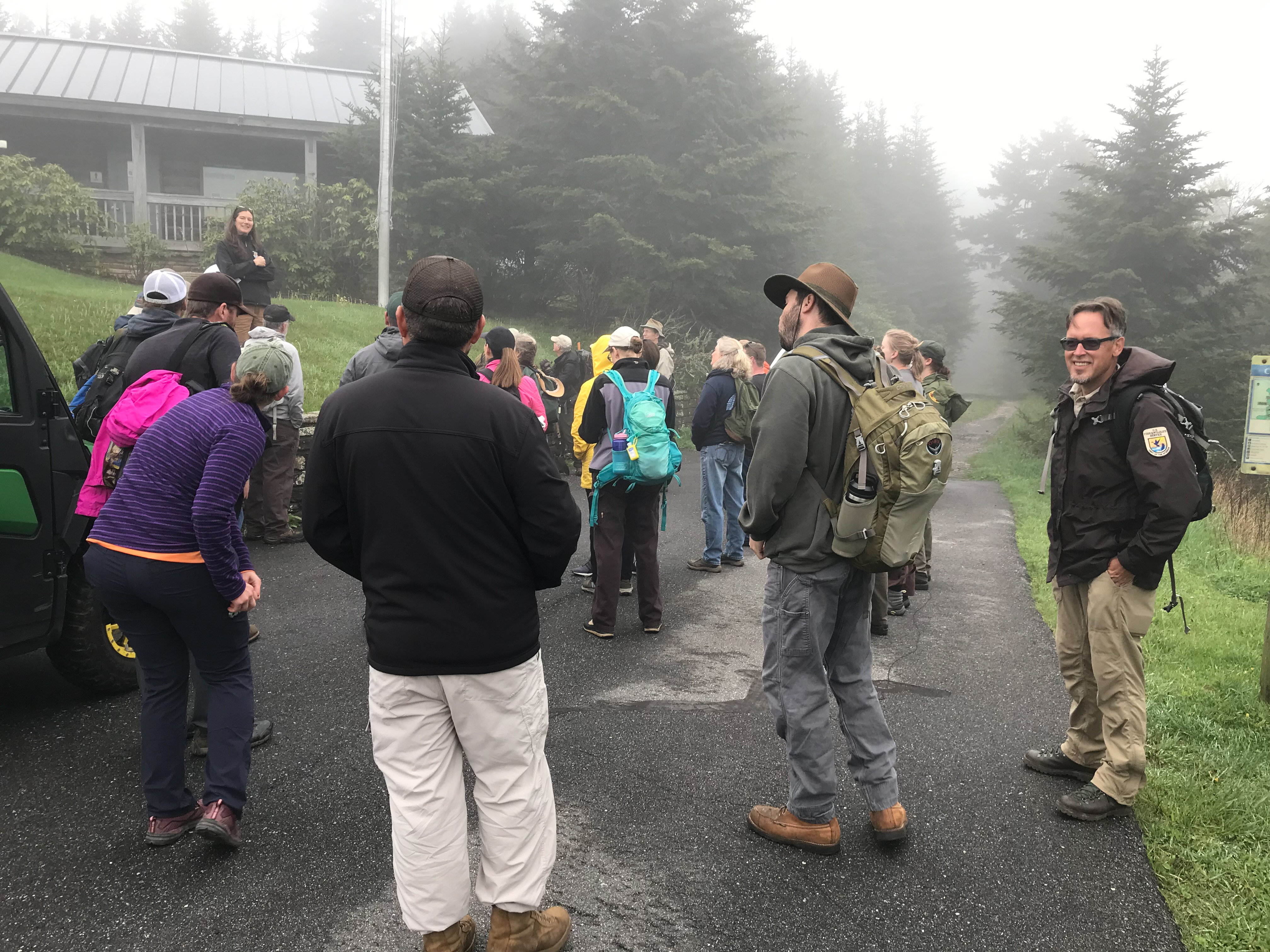 Sue Cameron gives instructions to people who turned out to plant red spruce at Mount Mitchell State Park.