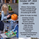 Flyer for the 2024 Fall Festival at the Cherry Valley National Wildlife Refuge on Saturday October 19th, 2024 from 10AM-2PM at the Refuge Headquarters located at 2138 Croasdale Road, Stroudsburg, PA 18360. Activities (all free of charge) include apple cider pressing, archery lessons, bat house building, cider donuts, crafts for kids, fishing lessons, hoverball lessons, live animal presentations, and more!