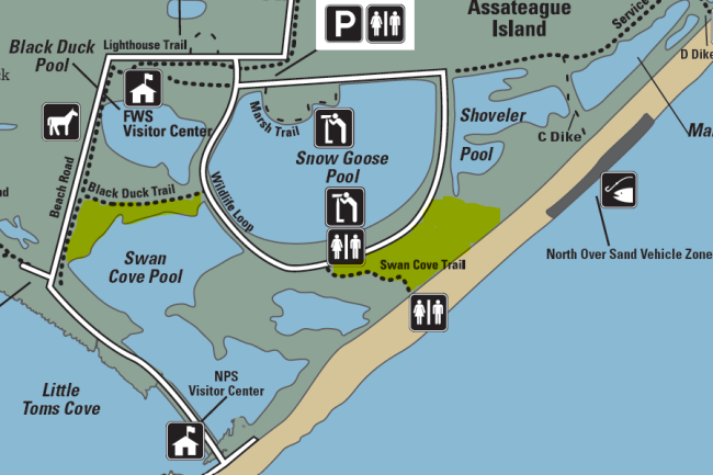 A map of Chincoteague National Wildlife Refuge with the two southern burn units highlighted (one north of Swan Cove Pool and one south of Shoveler Pool). The northern burn unit, Old Fields, is not pictured.