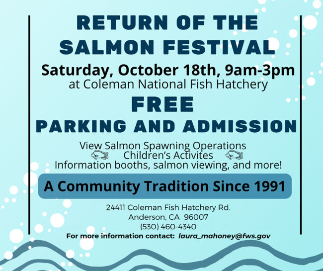 Join us for the Return of the Salmon Festival at Coleman National Fish Hatchery on Saturday, October 18, 2025. This free, family friendly event features the work done at the hatchery and visitors will have the chance to see salmon up close!