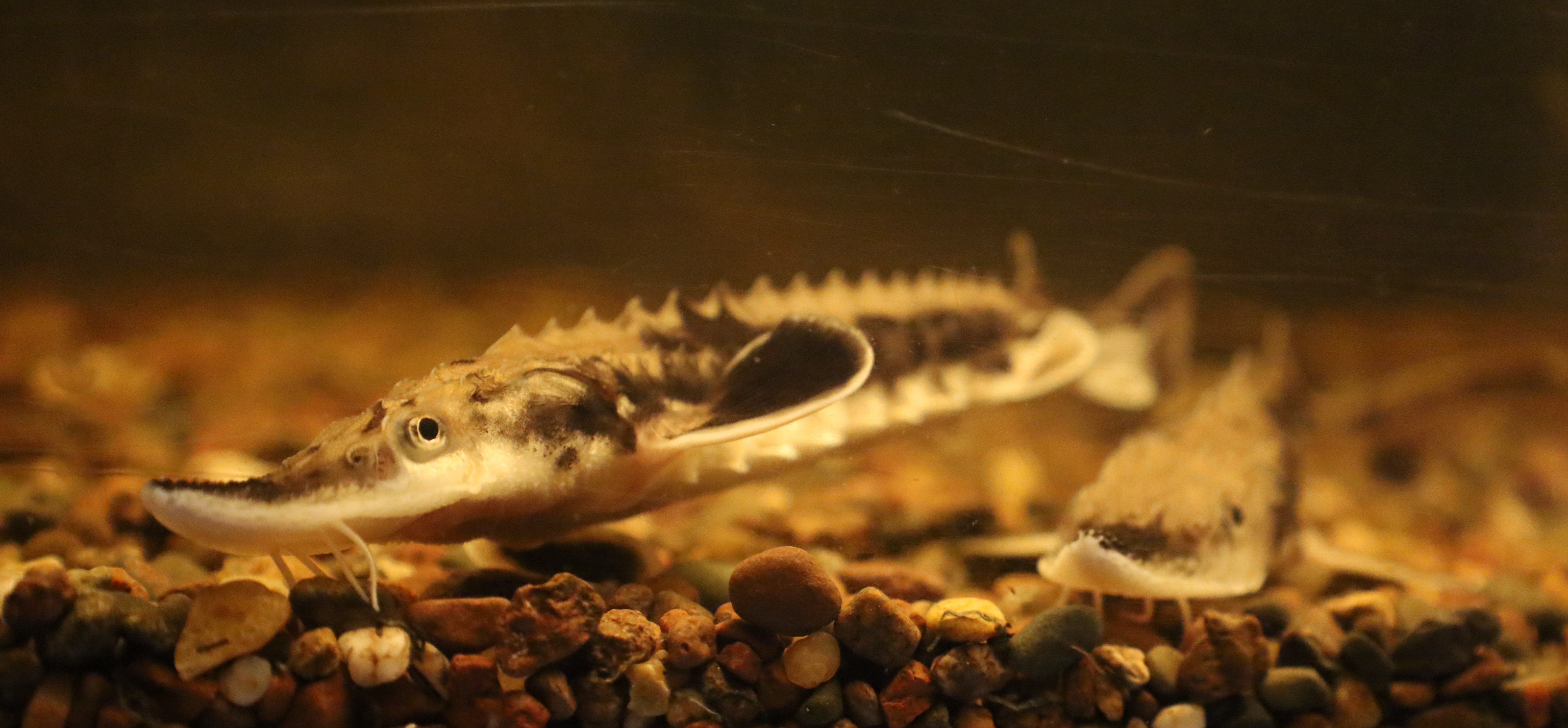 Two lake sturgeon with a good view of their barbels. These barbels have taste buds on them, that allow the fish to be able to taste their food before sucking it into their mouths.