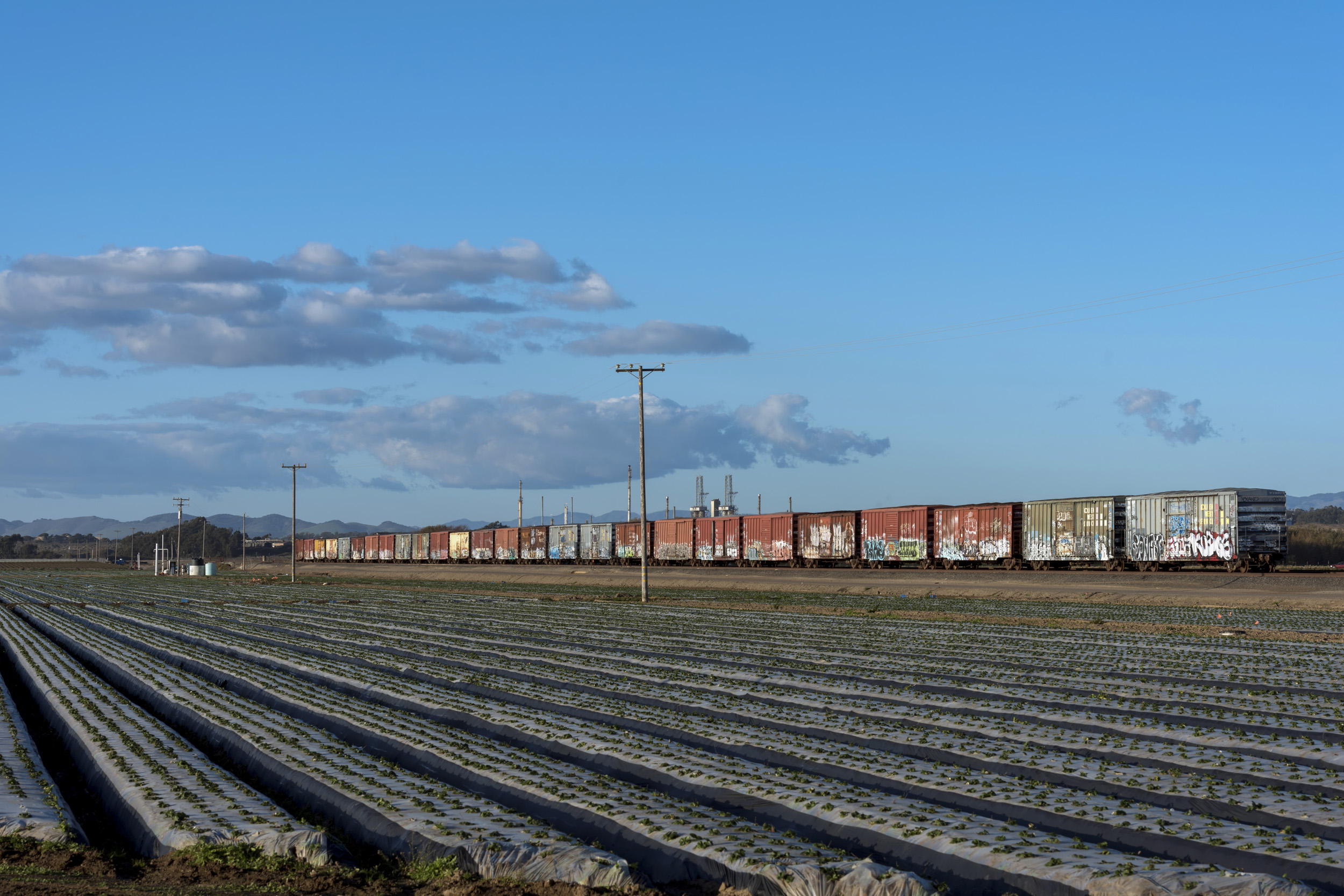 Strawberry fields cover the vast California landscape today. Pictured above is a string of freight cars near a strawberry field. Credit: Carol M. Highsmith/Library of Congress