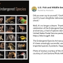 Text: Did you ever say to yourself, “Gosh, it sure would be cool if a Guam kingfisher delivered my mortgage check.” Well, it’s no longer a dream. Thanks to the yearlong celebration of the Endangered Species Act’s (ESA) 50th anniversary, a host of species stand ready to meet your United States Postal Service postage needs: (Link). The Endangered Species Act was passed in 1973, and it’s been amazingly successful, saving 99% of the imperiled species it protects. Happy #ESA50! Photo of stamps courtesy of the USPS. Species images courtesy of Joel Sartore/Photo Ark