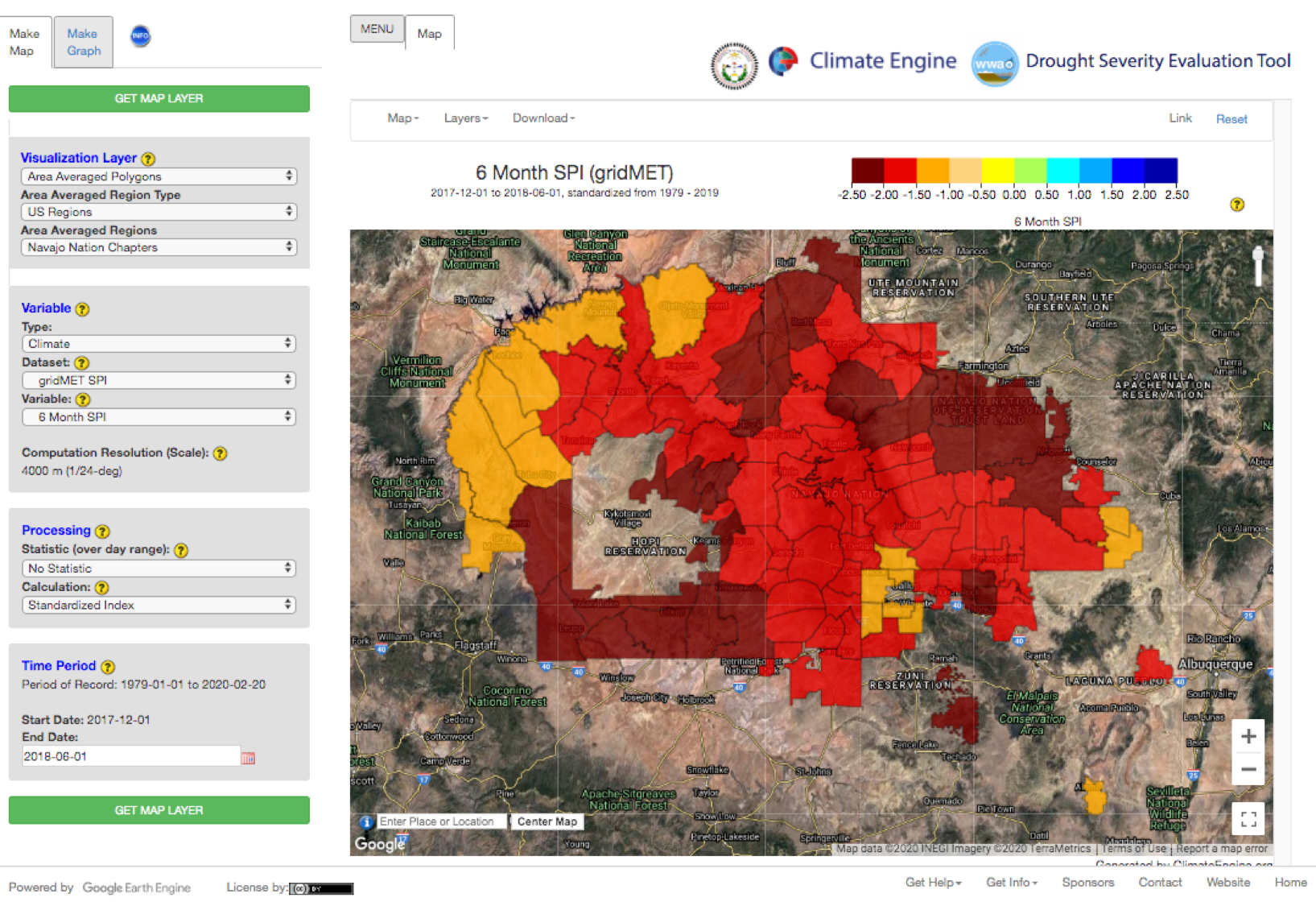Area-averaged polygons indicating the 6-month Standardized Precipitation Index (SPI) leading into the summer monsoon season of 2018 (end date of June 1, 2018), where much for the Navajo Nation experienced extreme or exceptional drought. A SPI index value is calculated as the area-average for each of the Navajo Nation's 110 Chapters.