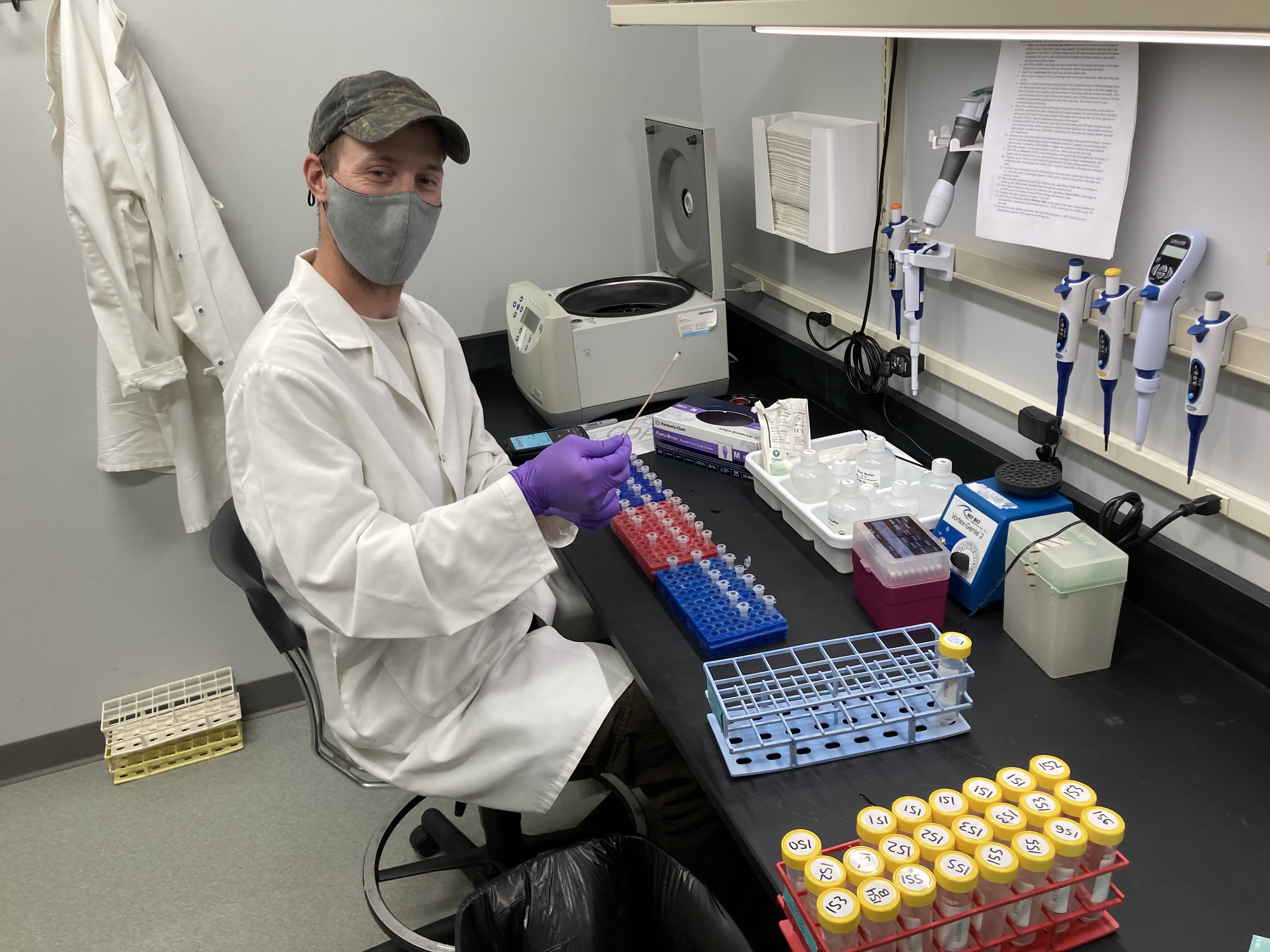 Aaron uses a swab to transfer the sample (it looks like a pellet) to new special tubes during the DNA extraction process.