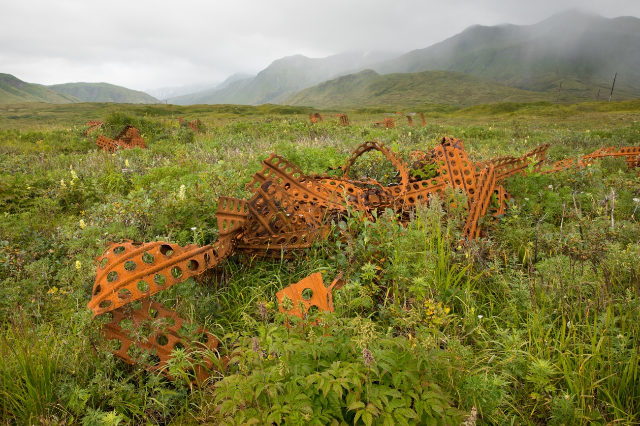 Marston matting twists in the tundra of Attu Island. These perforated steel strips were used throughout the Aleutians to construct quick, temporary landing strips during and after World War II.